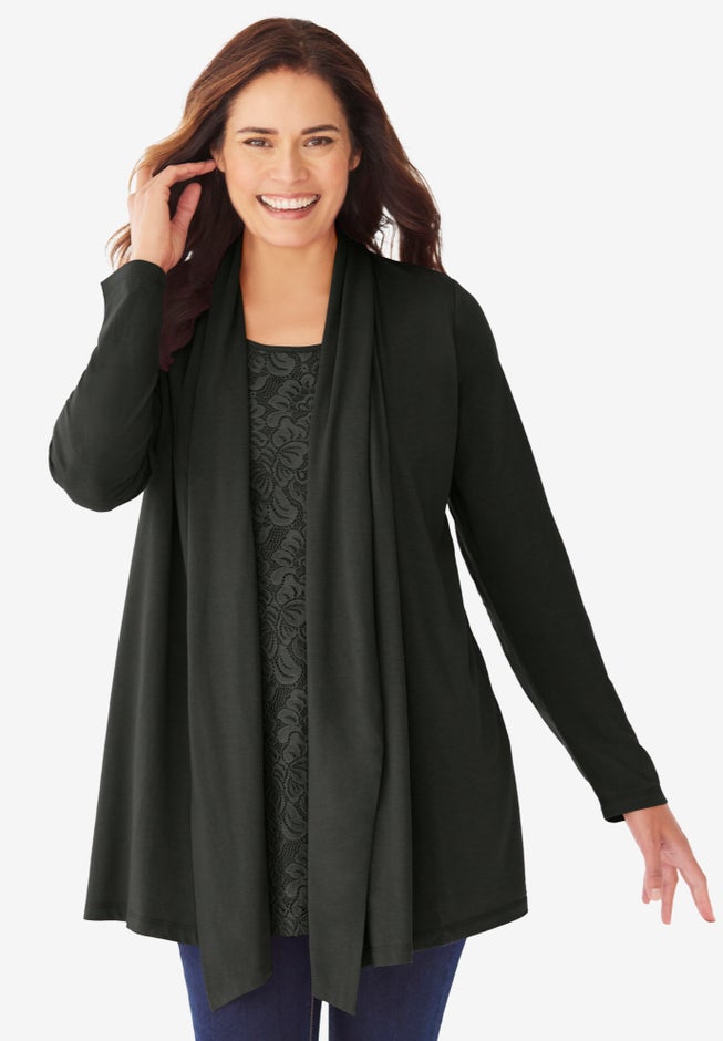 Item Number: 1071605Our 2-Fer Cardigan & Lace Tunic is the look of a beautiful lace tunic attached to an open front cardigan without the extra layers. This beautiful 2-in-1 style is relaxed and can easily be worn for many occasions.