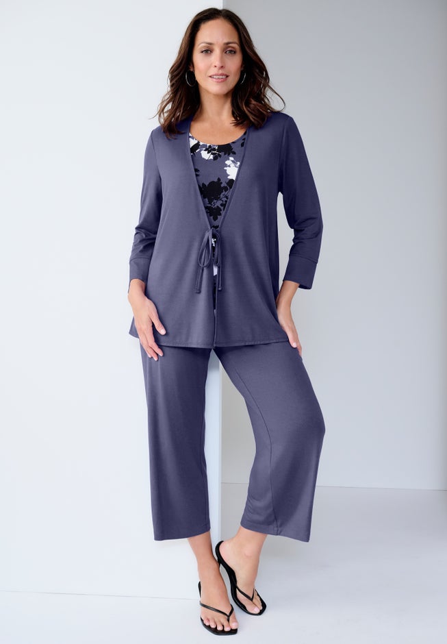 This chic and comfy twofer from Jessica London’s plus size women’s Everyday Stretch Knit Collection is the perfect top for looking put-together in a stitch. The printed inner layer is attached to the jacket-like outer layer, giving it a polished look with easy, fuss-free construction. Say goodbye to fiddling with two layers — all the style, none of the hassle.