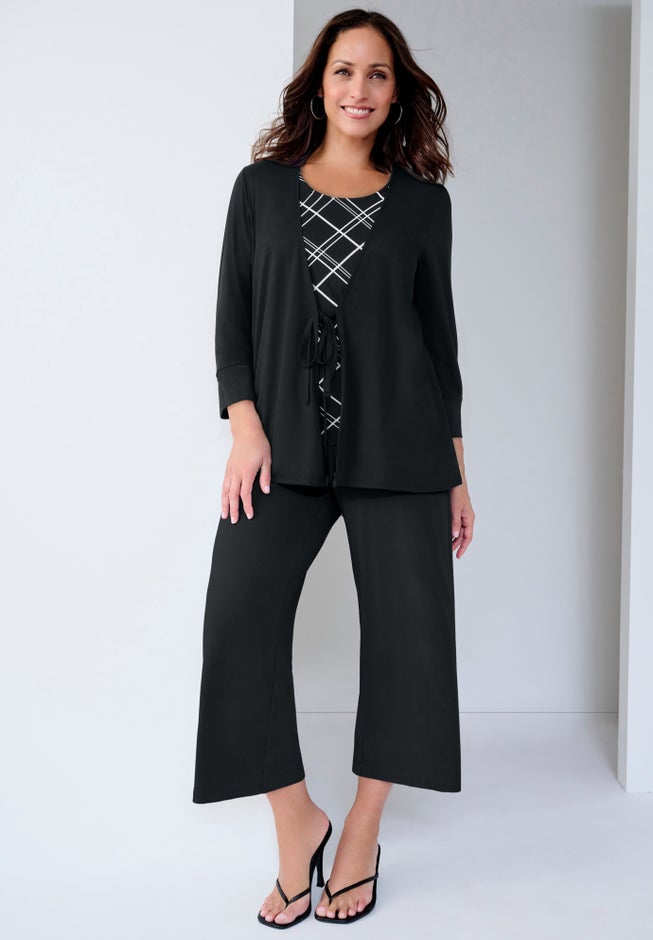 This chic and comfy twofer from Jessica London’s plus size women’s Everyday Stretch Knit Collection is the perfect top for looking put-together in a stitch. The printed inner layer is attached to the jacket-like outer layer, giving it a polished look with easy, fuss-free construction. Say goodbye to fiddling with two layers — all the style, none of the hassle.