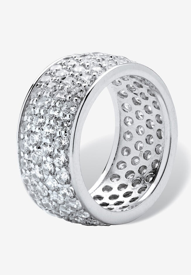 Inspired by coveted designer fantasy rings, this multi-row CZ eternity band is enhanced by round sparkling CZ accents for a knockout display of 3.30 carats T.W. Platinum-plated sterling silver. Sizes 6-10. We recommend that you order one size up for this style.