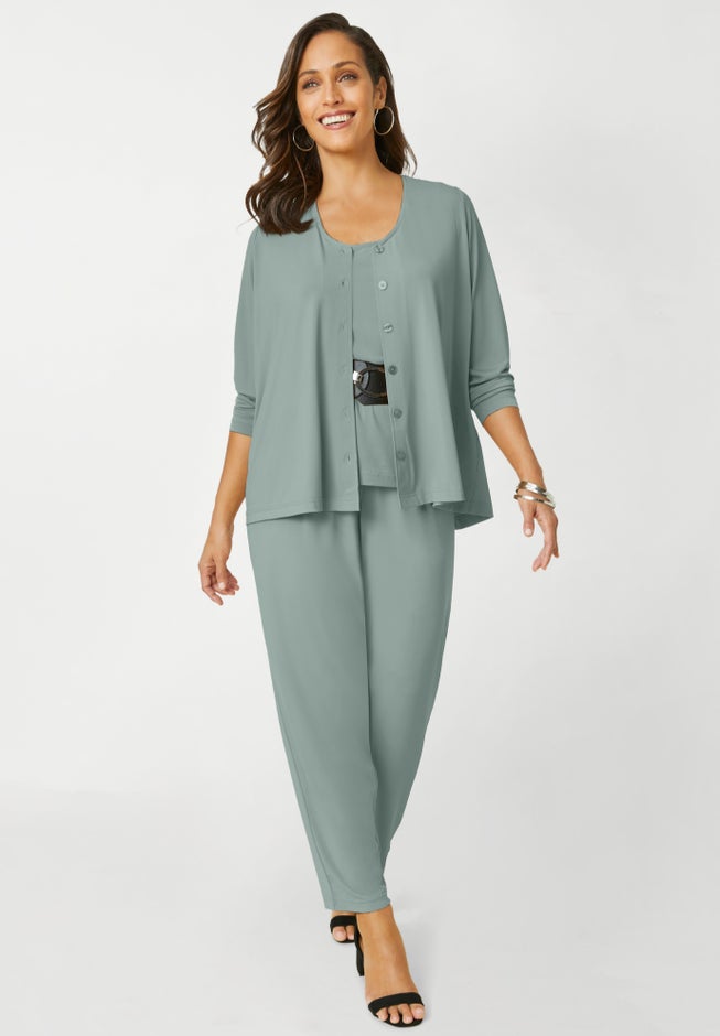 Meet the Jessica London women's plus size 4-Piece Stretch Knit Wardrober from The London Collection — it's your own curated capsule collection! Includes a tank, straight-leg pants, collarless jacket and scoop-neck dress for endless styling options. The stretch jersey knit drapes beautifully, keeps its smooth shape wash after wash, and packs without wrinkling.