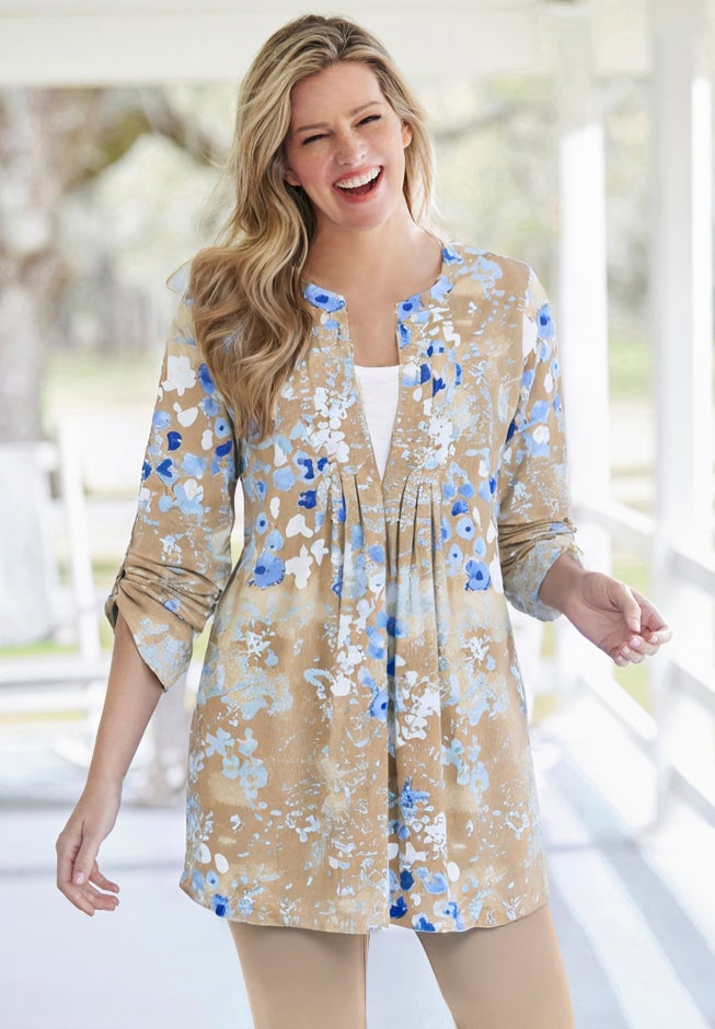 Item Number: 1007222This soft knit tunic features a split neck with box pleating on the sides for pretty detail. Made in the perfect hip-grazing length, a relaxed fit drapes easily over the body and feels oh-so comfy. Wear the sleeves long or roll them up with button tabs for a more casual feel.