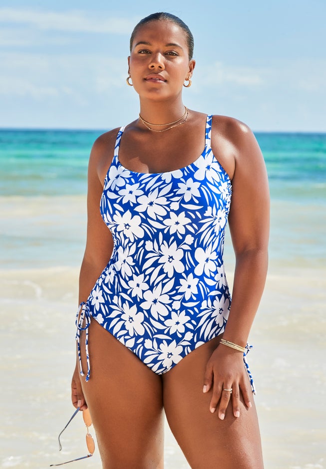 A top-notch one piece designed to let you personalize your fit. Hidden soft-cup underwire provides secure bust shaping, complemented by removable cups for customizable support. Power Mesh lining smooths through the front body, while adjustable scrunch sides allow you to fine-tune your silhouette. Featuring a scoop-back neckline and adjustable back straps with a slidable J-hook. Finished with full seat coverage and a modern leg opening.