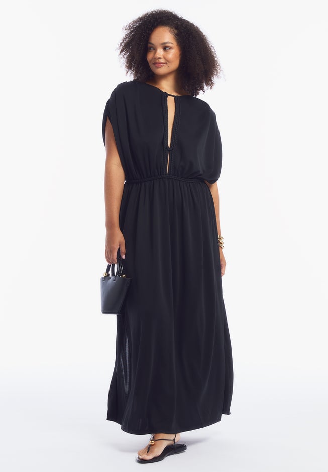 A breezy maxi dress with sculptural dolman sleeves and an open V-back that adds quiet allure. Braid detailing at the neckline and waist lends subtle texture and artisanal charm. Effortless and refined, it’s made for warm days that stretch into evening. Women's plus-size maxi dress.