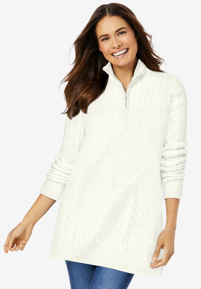 Item Number: 1022668A cable-knit textured pullover has a half-zip detail to complement a mock neck that keeps you warm and stylish. The extra soft knit is easy and breathable, creating a cozy piece that is still comfortable.