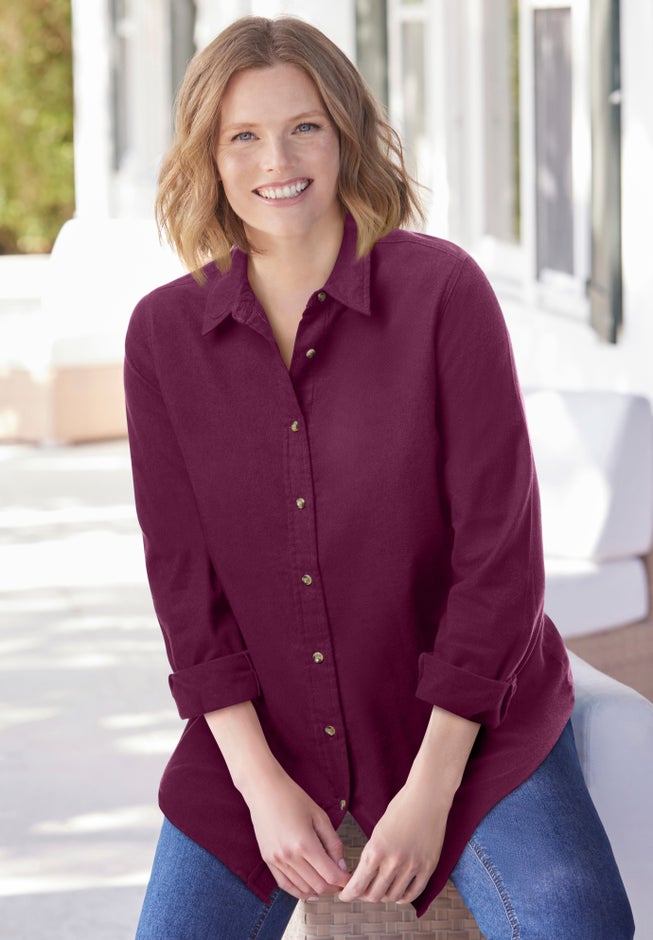 This cotton flannel is brushed to perfection for cozy comfort. A collar, button cuffs and button front add to the classic appeal. Made in a perfect tunic length that falls over the hips.