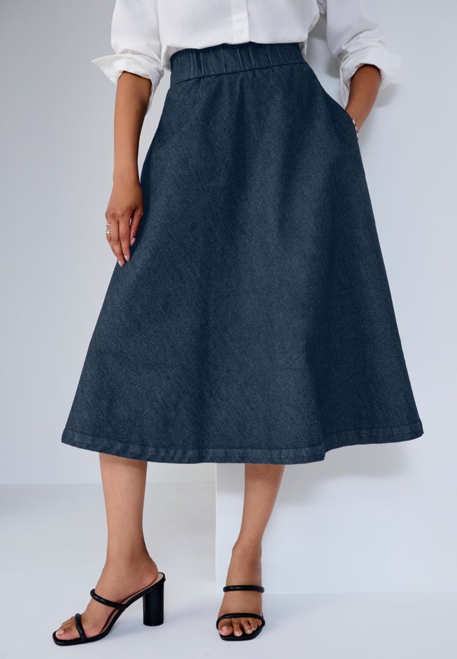 The Jessica London plus size women's Comfort Waist Stretch Denim Swing Skirt moves with you through dressing for the office, weekends or nights out.