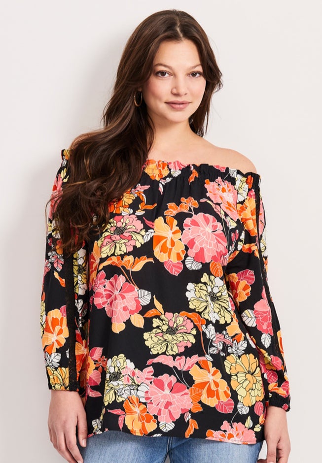 This top features an off-the-shoulder neckline with a gently elasticized edge for a comfortable and stylish fit. The long sleeves have a relaxed shape with subtle gathering at the cuffs, adding a touch of softness to the silhouette.