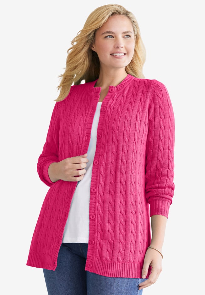 Item Number: 1004354Bold color, rich cable texture and softest pure cotton make this knit cardigan a welcome addition to your sweater wardrobe. The crewneck makes it a wonderful choice with a simple tee.