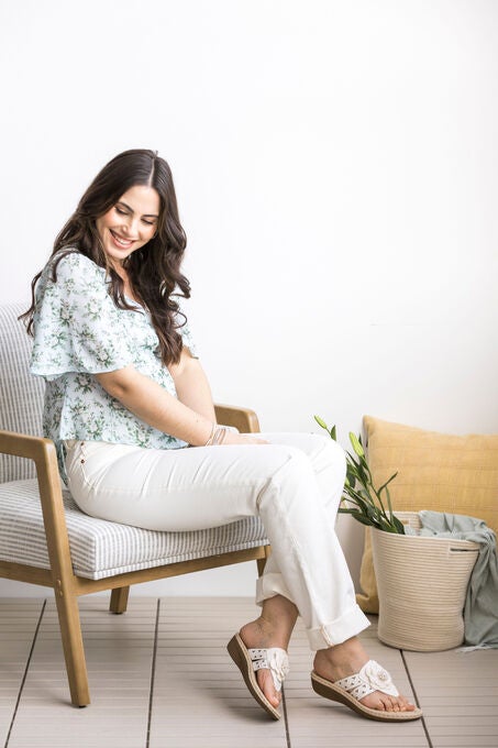 Searching for a beautiful summer sandal that you can dress up or down? Look no further! Let your sunny day style blossom in this wonderful wedge silhouette complete with a fancy floral applique.