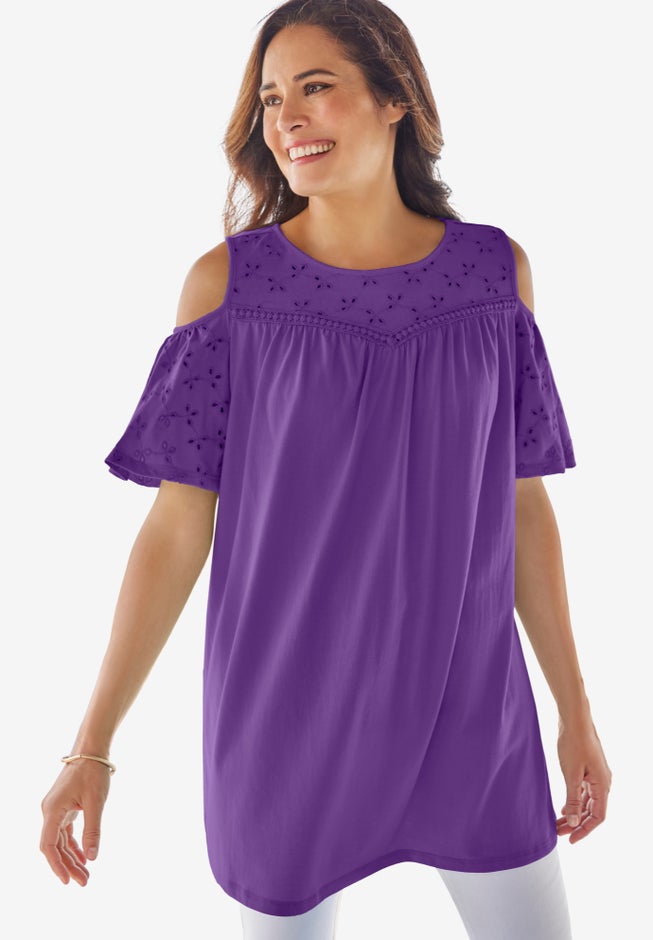 Item Number: 1064986Feel pretty in this eyelet tunic. Knit eyelet, pointelle and open stitch cold shoulder. Shorts Sleeves and straight bottom hem. A-line silhouette.