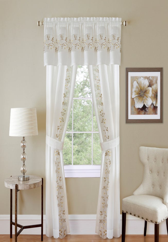 Delicate faux silk curtains detailed with intricate embroidery. Includes two panels, one attached valance, and two tieback shades.