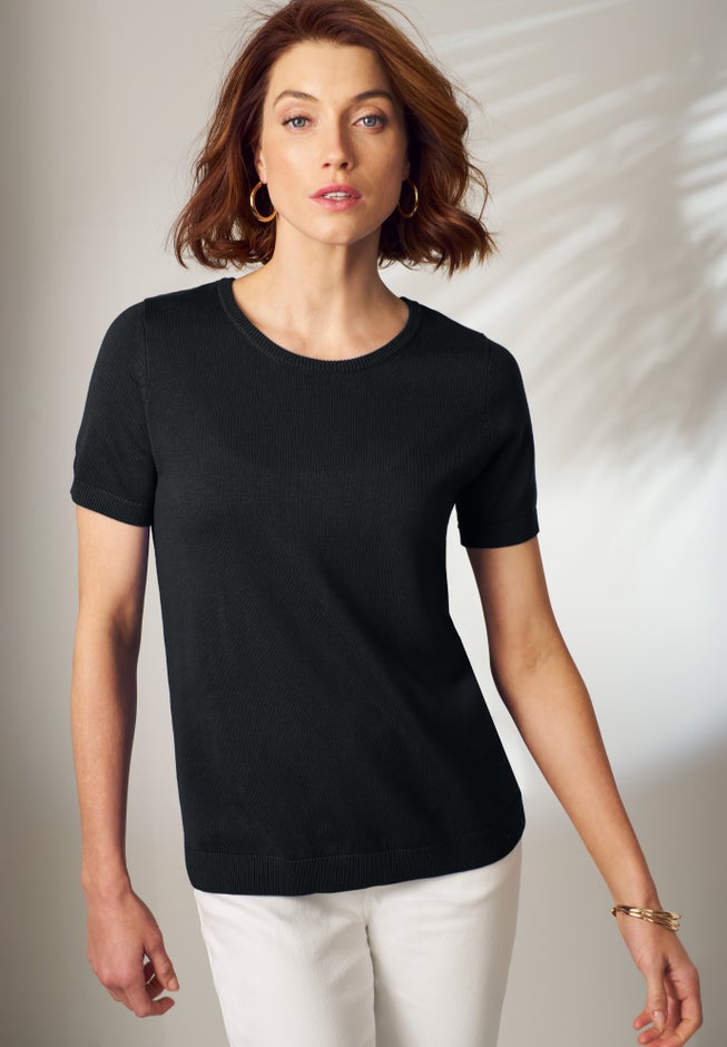 The Jessica London women's plus size Fine Gauge Collection Crewneck Shell is a fabulous, versatile classic that completes every wardrobe. Features a straight silhouette that flatters every figure and a crew neckline that conceals bra straps. Wear it on its own or as a twinset with the coordinating Jessica London Fine Gauge Collection Cardigan.