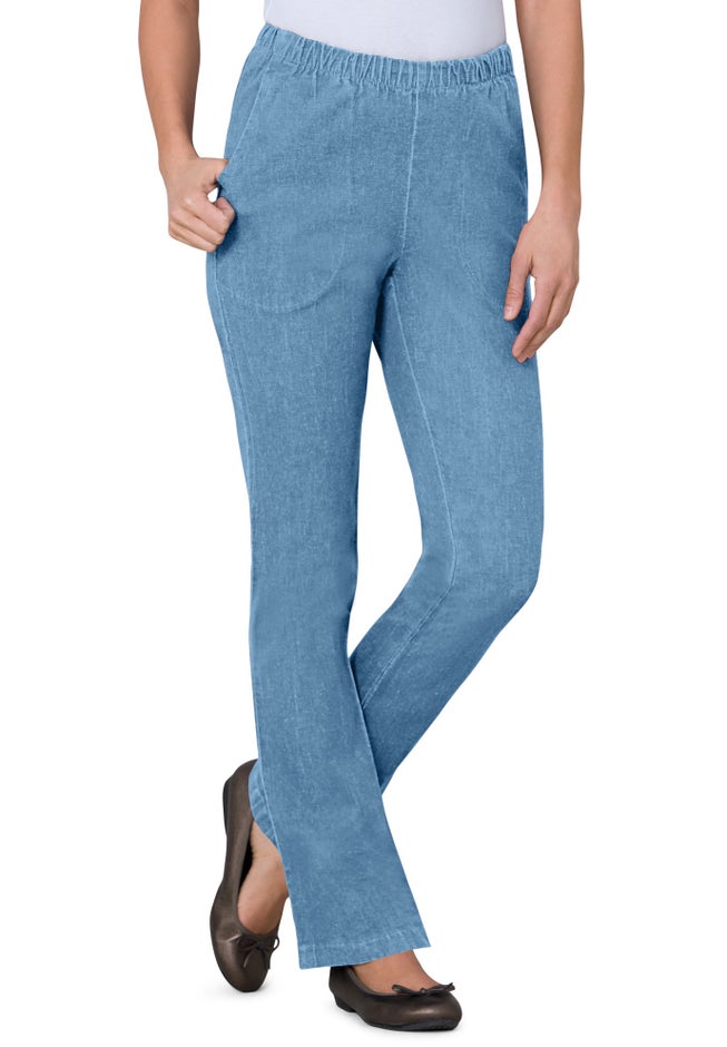 These jeans are fashioned with stretch to give you the perfect fit. Their all-around covered elastic waistband makes them even more comfortable. This pull-on style features slant pockets on the front and a pocketless back for a smooth look. These  bootcut jeans have a slight flare that fits over your boots..