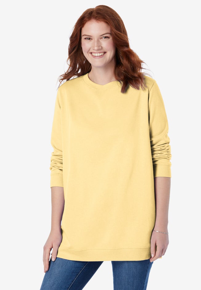Item Number: 1006959This essential long sleeve sweatshirt comes with a comfy fit and longer length. A classic V-stitched crewneck along with a ribbed hem and cuffs add a casual and sporty touch. Fully relax in this soft fleece tunic that comes in a mix of colors and prints to fit your style.