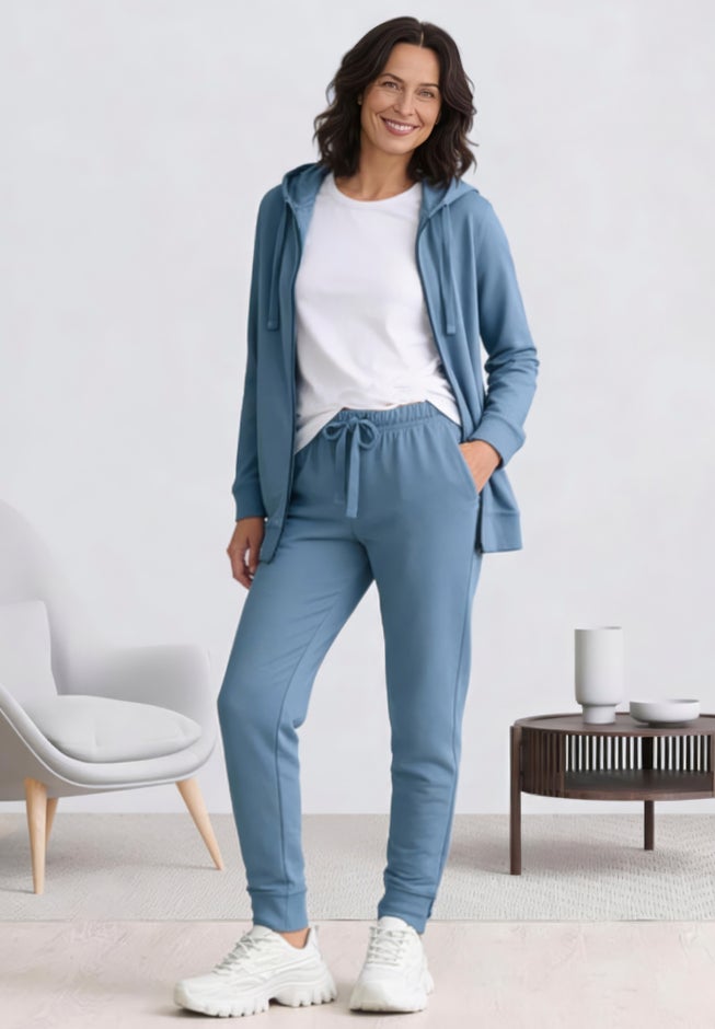 It features front slash pockets to hold your essentials and a drawstring hood for extra warmth. Whether you throw it over jeans and a tee for a quick coffee meetup or pair it with matching French terry sweatpants for a walk in the park, you’ll always look put-together and comfortable.