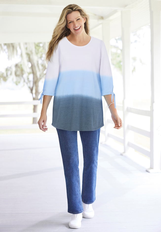 Item Number: 1040652This pullover sweatshirt with a comfortable scoop neck is accented with self ties on the three-quarter sleeves. Made in a longer tunic length with a curved hem that falls over the hips, you'll love how cozy this easy French terry style is.