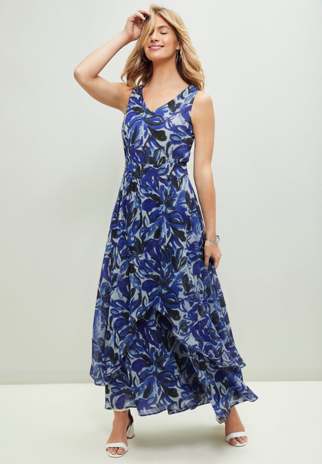 Instantly update your wardrobe with the Jessica London women's plus size Georgette Flyaway Maxi Dress. The fit & flare silhouette offers figure flattering style and is complete with an empire waist that complements your curves.