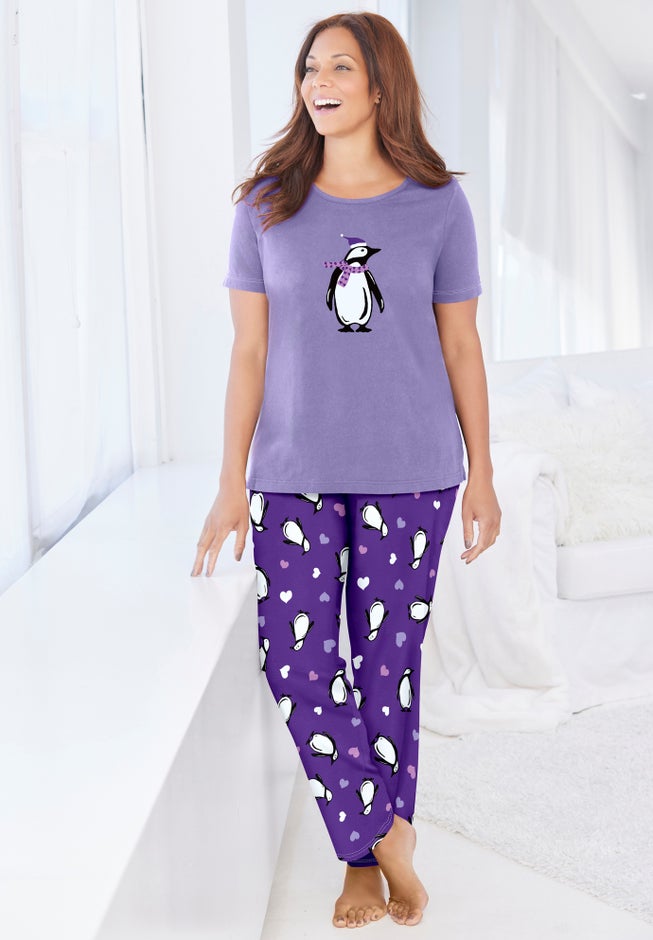 • Adorable graphic tee with small side slits paired with coordinating printed pajama pants for a charming look.