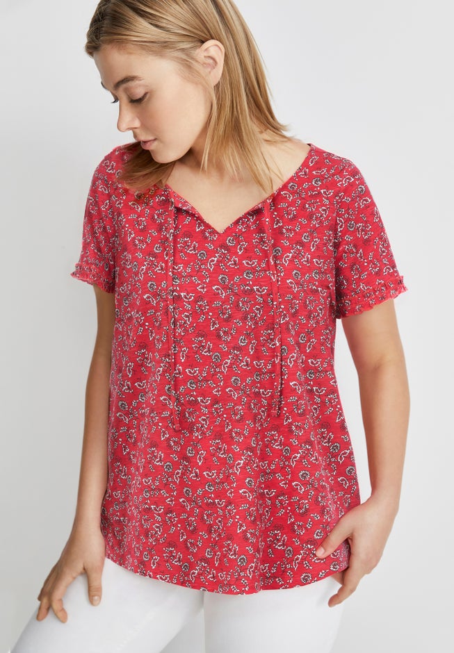 An everyday tee with a femme ruffle trim at the sleeve makes this a breezy addition to your warm-weather rotation.