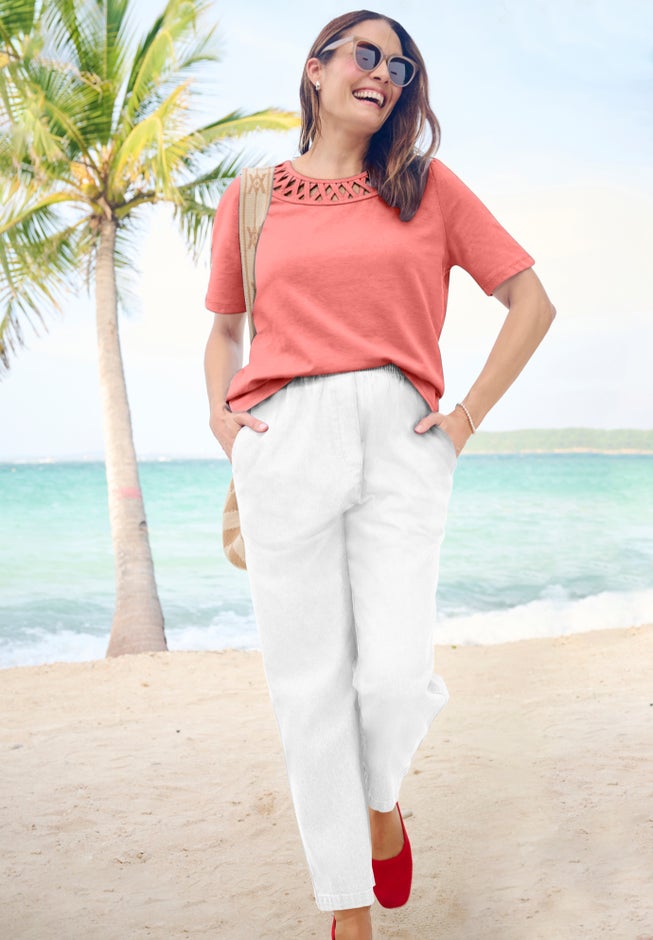 Item Number: 1114707This relaxed-fit tee gets a stylish upgrade with a lattice-trim neckline that adds just the right amount of detail. Short sleeves and a straight hem keep it easy and versatile perfect for pairing with jeans, capris, or your favorite casual bottoms.