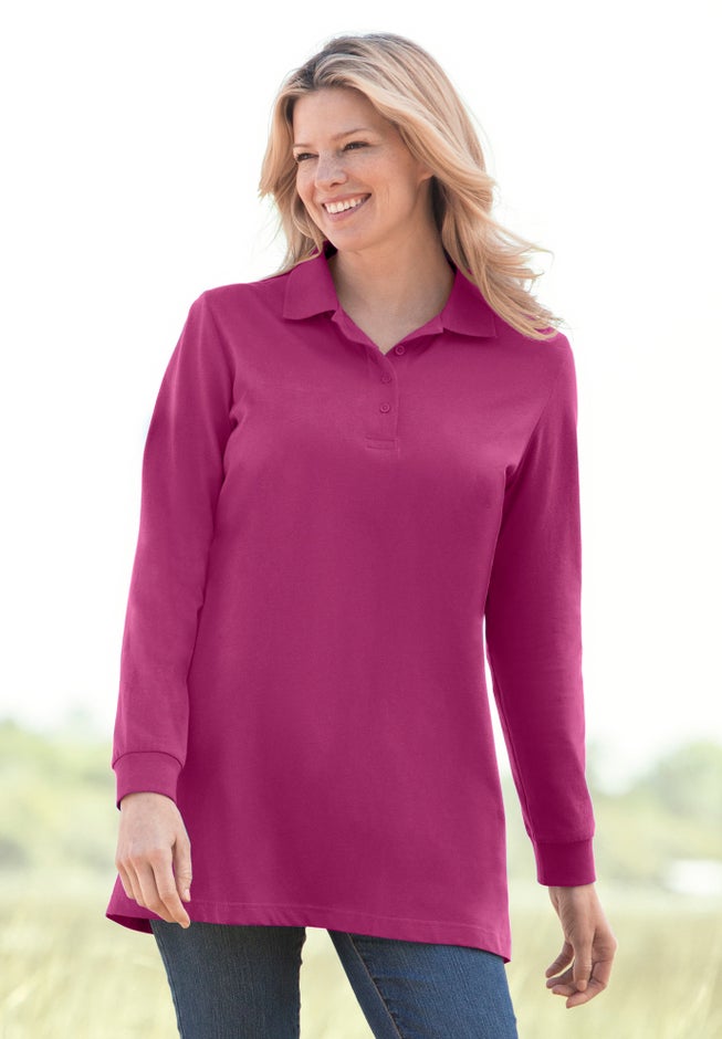 Item Number: 1005351This roomy polo knit is a cute choice for relaxed comfort and breathable ease. Ribbed cuffs allow you to push the sleeves up for a casual look, or wear them down, and a four-button placket with collar stays in line with the classic polo look. Made in our most-loved tunic length.