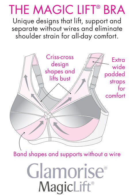 This full-coverage wireless bra features a Magic Lift® band that that crisscrosses around the cups to lift, shape and support without stiff wires. The extra-wide, adjustable straps feature light padding to prevent shoulder dig-in and comfortably stay up all day long. Beautiful embroidery and a petite bow accent the cups for a pretty touch.