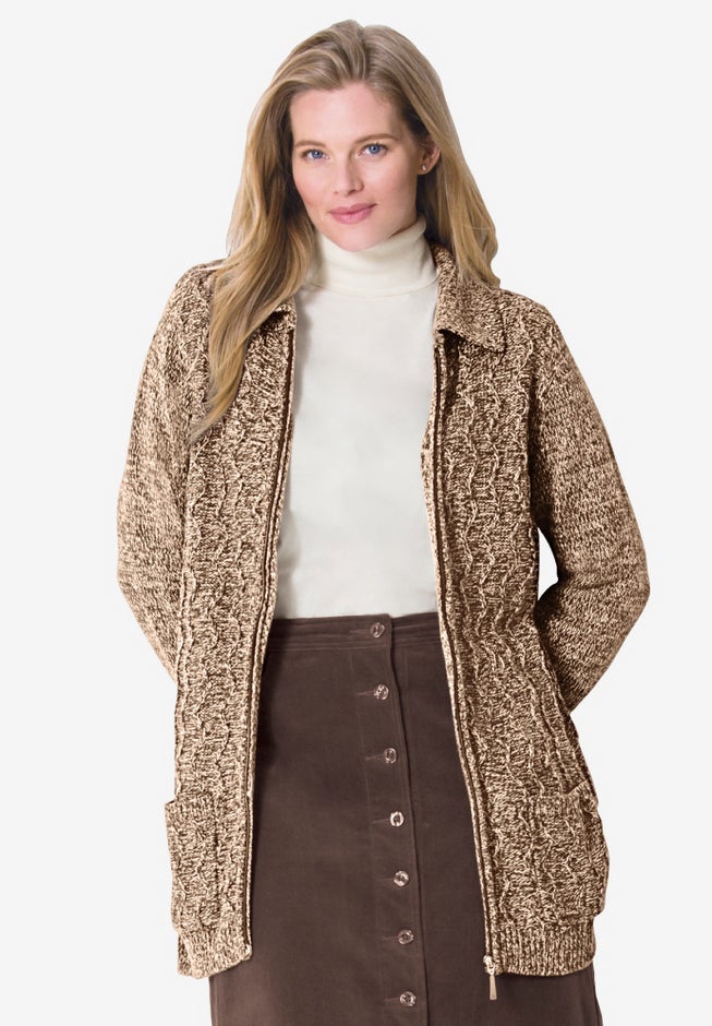 Item Number: 1006533This cozy cabled cardigan has a zig-zag texture and marled coloring that comes in a range of subtle colors to pair perfectly with all your tees. A zip front gives you the option to wear it open or zip it up for extra warmth. Made with handy front patch pockets.