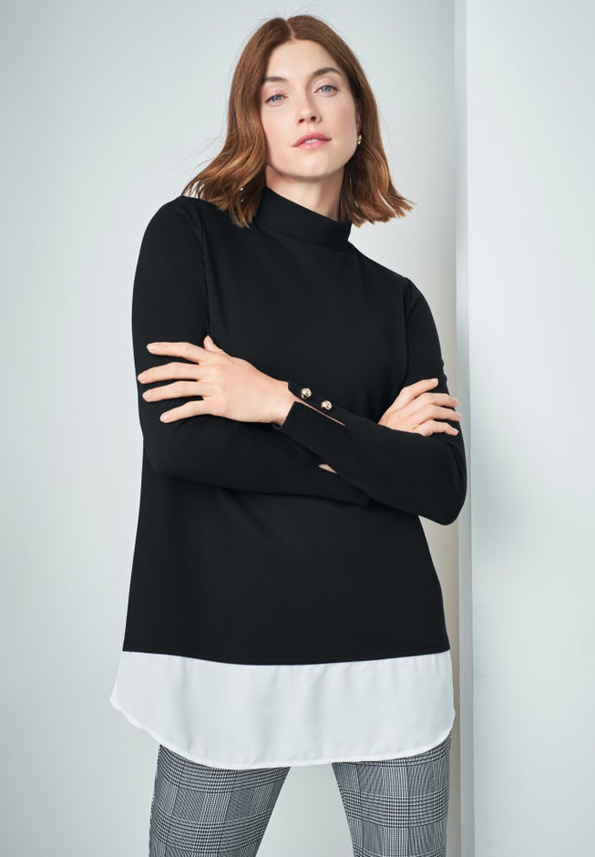 Achieving a layered, sophisticated look is easy with the Jessica London women's plus size Mixed Media Ponte Top. This piece pairs perfectly with our Ponte Leggings — complete your outfit with your favorite pumps or knee-high boots.