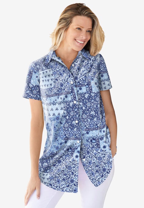 Item Number: 1004122One of our comfort classics, this perfect button down shirt with short sleeves made in breathable cotton is ideal for warmer days. A relaxed fit and longer tunic length provide maximum comfort that layers easily over any bottom. Wear it as a blouse, or leave it open over one of your favorite tanks or tees.