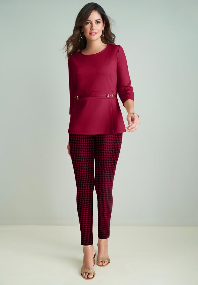 Flattering fit and flare top with nonfunctional golden belt at waist. Pair it with your favorite leggings or dress it up with a skirt to complete the look.
