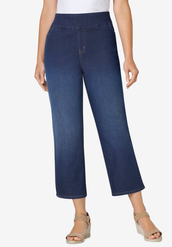 These easy, denim capri jeans are designed with a full covered pull-on elastic waistband that lies flat against the body, providing a smooth look under all your favorite tops and tunics. Enjoy the classic look of a great pair of jeans that move comfortably thanks to allover stretch.