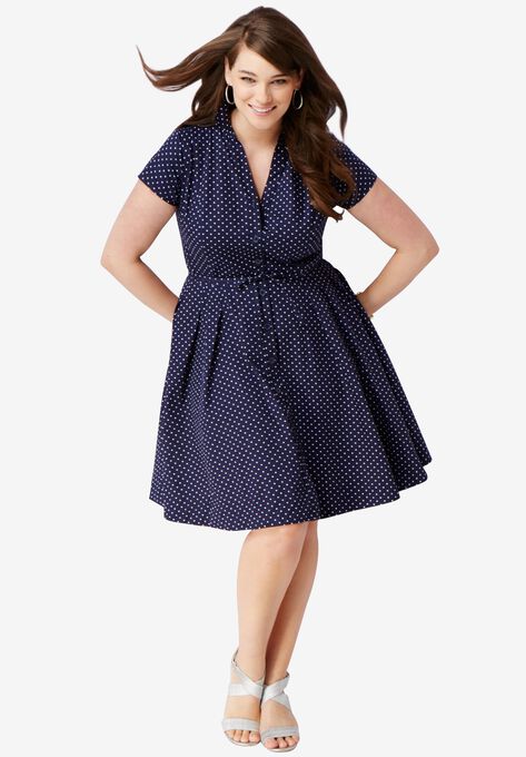 Full button front dress with shirt collar and slight Y-neck. All-around pleats. Belt loops with tie. Pockets. Front princess seams and back waist darts.