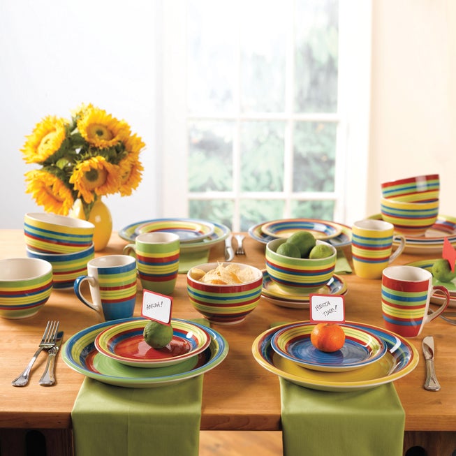 Our 16-pc. stoneware dinnerware set with green, blue, red, and yellow stripes brightens up your kitchen countertop and dining table with a touch of Southwestern flair.