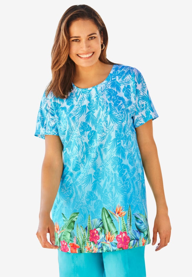 If you're looking to spice up the prints in your wardrobe this watercolor tunic is it! Crewneck with allover sublimation print. Perfect pop of print with pair with your solid bottoms. Relaxed fit with a straight hem to keep you comfy.