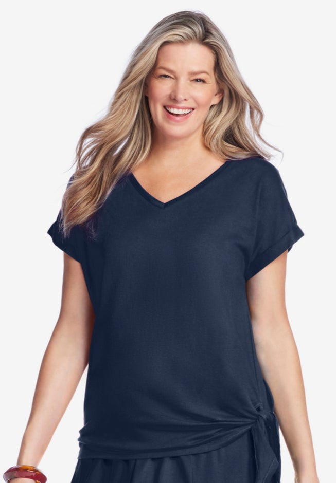 Item Number: 1048072Smooth V-neck jersey tee has a cute side tie and cuffed short sleeves.