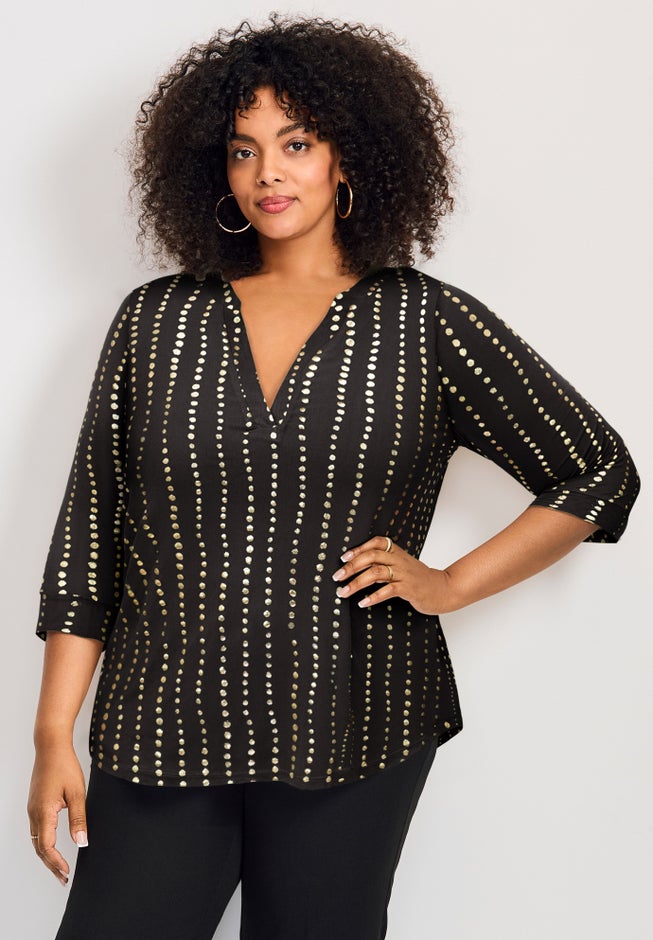 This top features a relaxed silhouette with a gently flared hem for a flattering, comfortable fit. It includes three-quarter sleeves and a notched neckline that adds a touch of effortless elegance. The lightweight, semi-sheer fabric offers easy layering for both casual and polished looks.