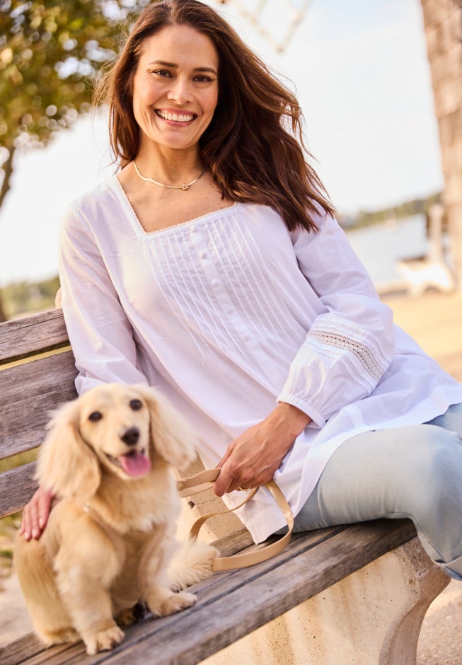 This plus size women’s boho chic blouse is perfect for any season. Lightweight with crochet and feminine details at sleeves. Pretty pintucks and decorative buttons at center front. This flowing blouse transitions seamlessly from polished to relaxed looks.