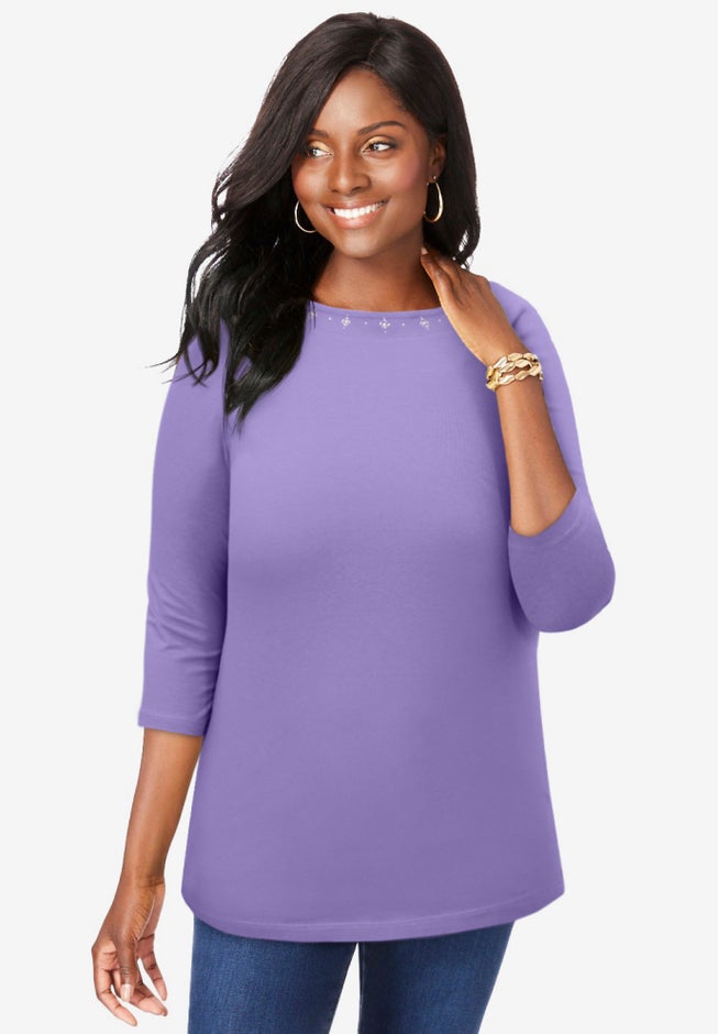 The Jessica London plus size women's three-quarter sleeve Stretch Cotton Boatneck Tunic is an everyday essential for every body, and is available in bright bold hues as well as pretty patterns and prints. The flattering relaxed fit is easy to dress up or down, and the longer tunic length eases over all of your favorite bottoms.