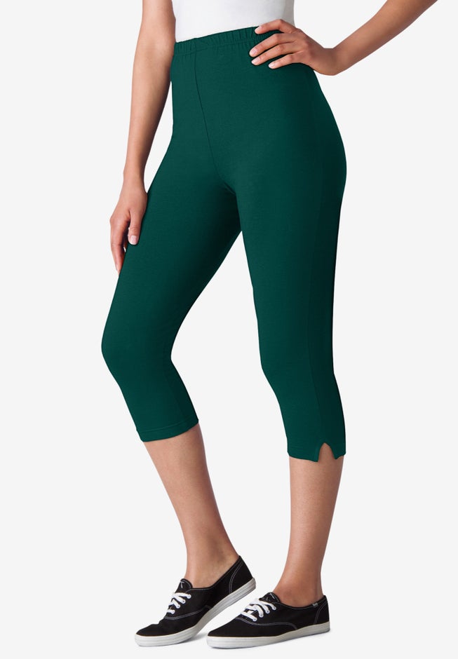Item Number: 1010715Start a great athleisure outfit with these stretch cotton knit pull-on capri leggings! Ideal for everything from lounging to running errands, they offer a comfy, flexible fit that moves with you. The fully covered elastic waistband ensures all-day ease. Their sleek, body-hugging silhouette creates a look that beautifully contrasts with relaxed-fit tops or oversized sweaters. This combo balances comfort and style effortlessly. Plus, the breathable stretch-cotton blend keeps you comfortable all day long!