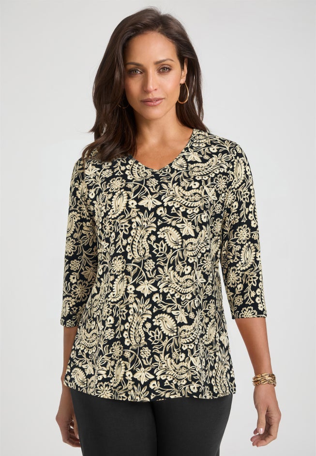 A classic and comfortable staple in every woman's wardrobe, this feminine V-neck tee is better than basic. Striking the perfect balance between fitted and relaxed, complete with three-quarter length sleeves, this everyday essential style is cool enough to wear out, yet cozy enough to lounge in.