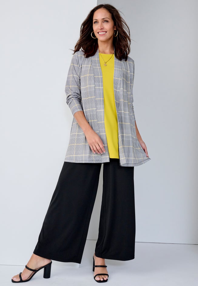 A chic layer to throw over your everyday separates, Jessica London women's plus size London Collection Stretch Knit Open Front Knit Topper adds an instant pop to any look. Features tulip sleeves and a side slit. The stretch jersey knit drapes beautifully, keeps its smooth shape wash after wash, and packs without wrinkling.
