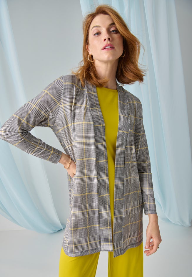 This women’s plus size open-front topper features a relaxed silhouette that layers smoothly over your everyday pieces, crafted from stretch jersey knit that maintains its soft shape wear after wear. With tulip-style sleeves and side slits, it delivers effortless movement and versatility whether you're dressing up or keeping it simple.