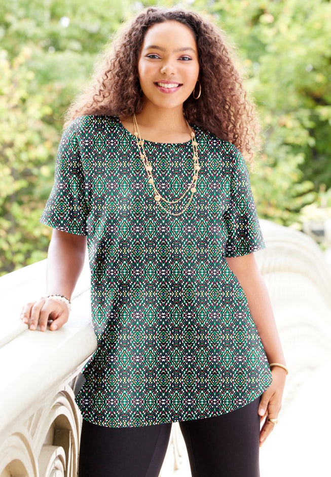 FIT: Relaxed and feminine with a comfortable scoop neckline and short sleeves.