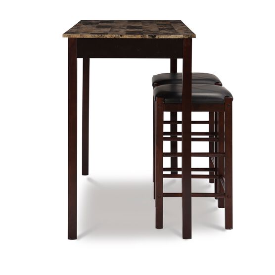 Tavern 3 Piece Counter Set with space saving convenience. This set features a simple rectangular table on long sturdy legs with two backless counter height stools with padded, black vinyl seat covers. Made from solid woods and a faux stone paper wrapped top. The rich Espresso finish gives this piece an elegant and sophisticated appeal. The stools tuck neatly under the table when not in use. Stools – 13.75” x 13.75” x 24” Stool weight limit is 275 pounds.