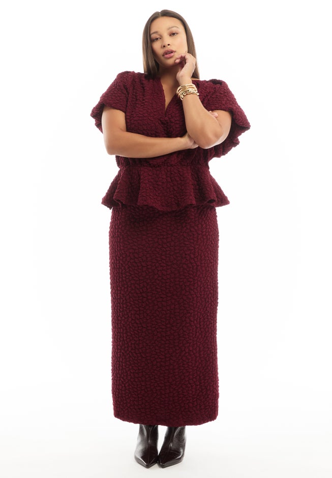 Comfortably stitched in a textured knit, this column knit midi skirt features an elastic-back waist and pull-on ease. Its clean lines and pared-back disposition make it endlessly versatile. Women's plus-size knit midi skirt.