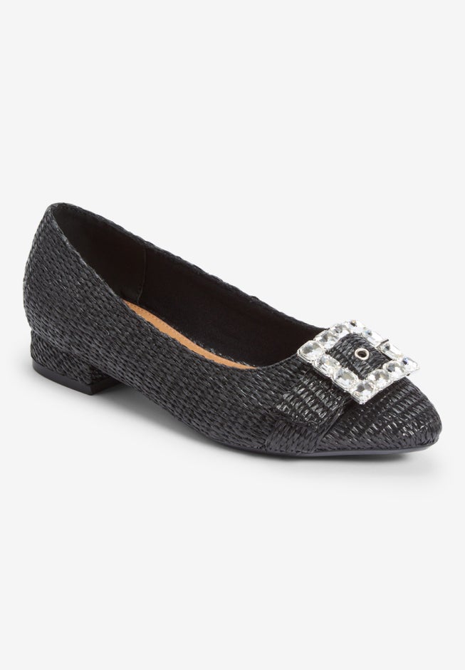 Meet your new favorite flat for effortless, all-season style. This pair gets dressed up with a pretty woven raffia upper and a bedazzled buckle.