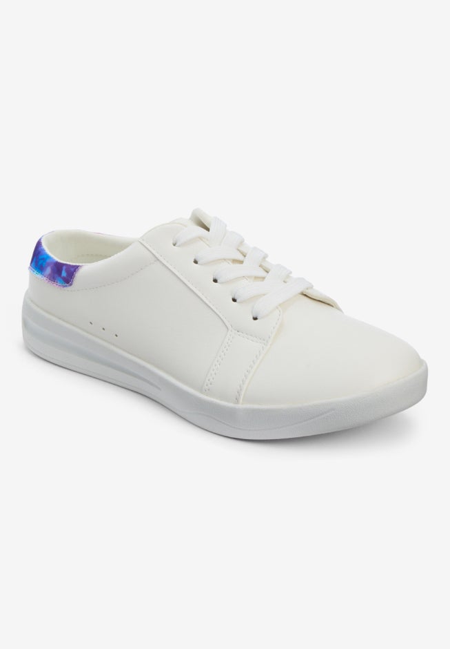 The best of what you love in your favorite sneaker, plus all the benefits of your favorite mule! This versatile pair features a leather-like upper with sweet multi-color fabric detail on the heel, plus adjustable laces for a secure fit.