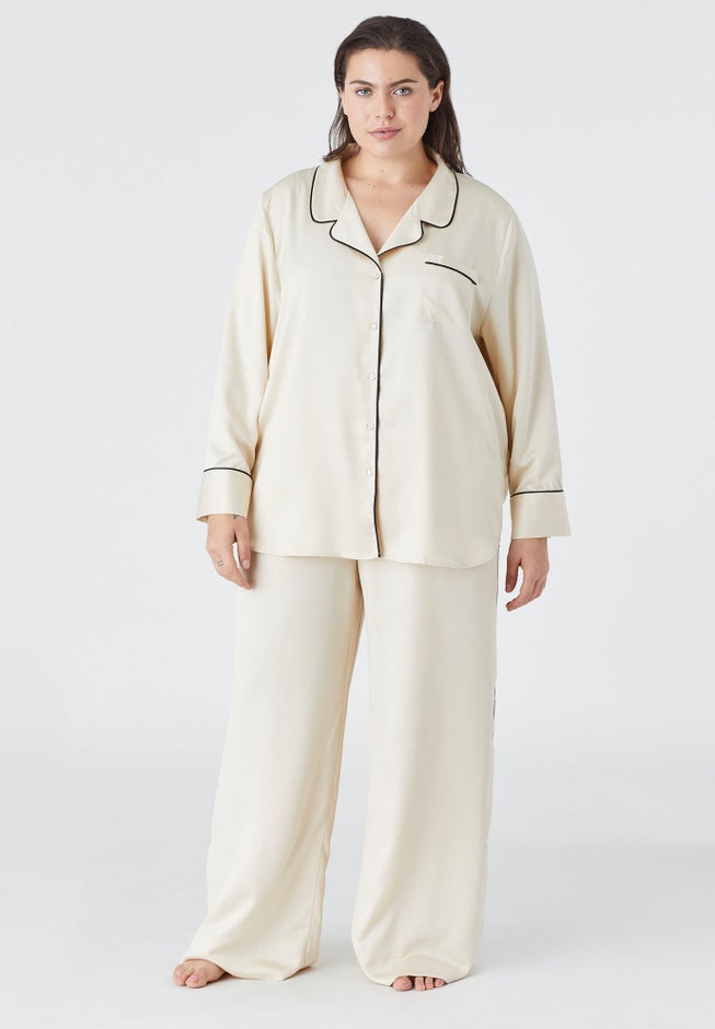 • A stylish pajama set with a relaxed fit, finished with contrast piping and mother-of-pearl buttons