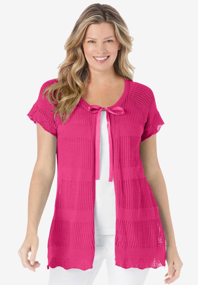 Item Number: 1004951Coverage, comfort, and style, this Tie-Neck Pointelle Cardigan Sweater has it all. Its drapey silhouette is flattering and is breathable enough to wear on warmer days. Pair this cardigan with everything from a dress to a tee and jeans.